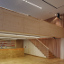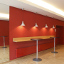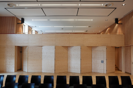 Dieser Mehrzweckraum, ursprünglich eine kahle schlecht belichtete Betonhülle, sollte in einen heimeligen, eleganten, klimatechnisch und akustisch vorbildhaft funktionierenden Saal umgestaltet werden, der allen Anforderungen gerecht wird und schnell adaptiert werden kann. Mit dem Münchner Akustikbüro Müller BBM wurde als Wand- und Deckenaufbau eine schlichte und kostengünstige Fichtenholzlattung gewählt, die darunter liegende Isolierung mit rotem Erbsentüll bespannt und im Bühnenbereich rote Samtvorhänge gehängt. Unter der Galerie wurde eine Bar eingerichtet, die für Catering oder die hauseigene Bewirtung ausgerichtet ist und mit Schiebewänden vom Hauptsaal getrennt werden kann. Der Zugangsbereich wurde mit Spiegeln und roter Wandfarbe aufgefrischt und den Toiletten ein bunter Anstrich verpasst.