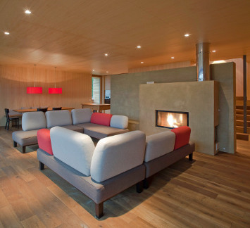 Für die Ferienwohnung in der Ramsau wurde eine Innenausstattung konzipiert, die an die Tradition der Sommerfrische im Salzkammergut erinnern soll. Die Decken und Wände sind in hellem Tannenholz gehalten, die Böden in dunkler Eiche, bequeme Sitzmöbel und Vorhänge aus dem ortsüblichen Loden gefertigt. Ein klobiger Jogltisch dient als Kochinsel, die Küche ist in Wandpaneelen integriert.