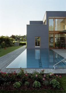 Das zweigeschossige Esszimmer und die Küche, Freiplatz und Swimmingpool liegen aneinander gereiht und verschmelzen vor allem im Sommer, wenn die raumhohen Schiebeelemente offen stehen, zu einem ferienhaft anmutenden Ganzen. Etwas dezentral liegt der eher klein gehaltene Wohnbereich, der hauptsächlich dem entspannten Musik hören und Fernsehen auf großflächigem Screen vorbehalten ist. Im Geschoss darüber verbindet ein langer Gang als Brücke die getrennten Schlafbereiche.
